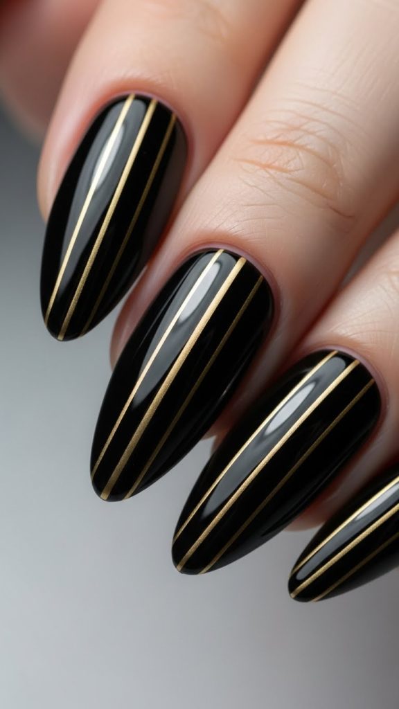Black nails with thin gold lines create a delicate yet impactful design. Prepare the nails thoroughly, ensuring the surface is smooth and clean. Use a rich black polish as the base color. Apply two thin coats and let them dry completely. Next, use a gold nail art striping polish, gold gel paint, or metallic nail tape to create fine lines. Popular placements include vertical lines near the center of the nail or diagonal lines across the surface. If using tape, cut pieces carefully and press them into the tacky layer of slightly dried polish. Seal all lines with a high quality top coat to prevent lifting. The contrast between black and gold offers luxury and elegance in a simple format. This style suits evening wear and pairs effortlessly with formal attire. It adds sophistication without appearing overly dramatic or embellished.