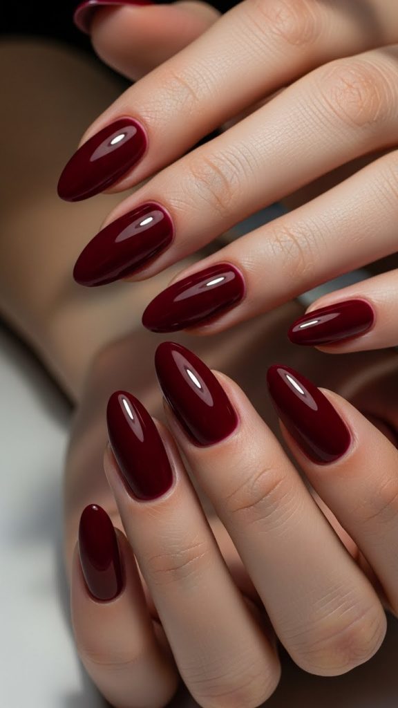 Deep wine red nails bring a sense of mystery and luxury. Begin with a full nail preparation routine that includes cleaning, shaping, buffing, and hydrating the cuticles. For the materials, choose a burgundy or wine red gel or traditional polish depending on the durability you prefer. A smoothing base coat is important for this shade because it prevents stain transfer to the natural nail. Apply the base coat thinly and let it dry. Add the first coat of wine red polish and allow it to level naturally. Apply a second coat for opacity. If you use gel polish, cure each layer properly under a UV or LED lamp according to the manufacturer guidelines. Finish with a clear top coat to intensify the depth of the color. The rich tone works beautifully for formal occasions and pairs well with gold rings or dark outfits. The final appearance is elegant without being overly dramatic, offering a mature and polished look suitable for all seasons.