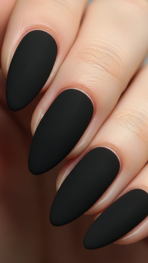 Matte black nails are a contemporary version of the classic dark manicure. To begin, carry out a thorough nail prep including cuticle care, shaping, and buffing. Matte finishes highlight imperfections, so ensure the nail surface is smooth. Materials include matte black polish or black polish paired with a matte top coat, a high adhesion base coat, and lint free wipes. Apply the base coat thinly and allow it to dry fully. Add two smooth coats of black polish, making sure they are even. Finish with a matte top coat, applied carefully to avoid patchiness. Matte surfaces dry quicker but also show fingerprints more easily, so avoid touching the nails until completely dry. The matte texture offers a soft and modern effect that complements minimalistic outfits or edgy fashion styles. Matte black nails communicate confidence and understated elegance while remaining simple enough to maintain regularly.