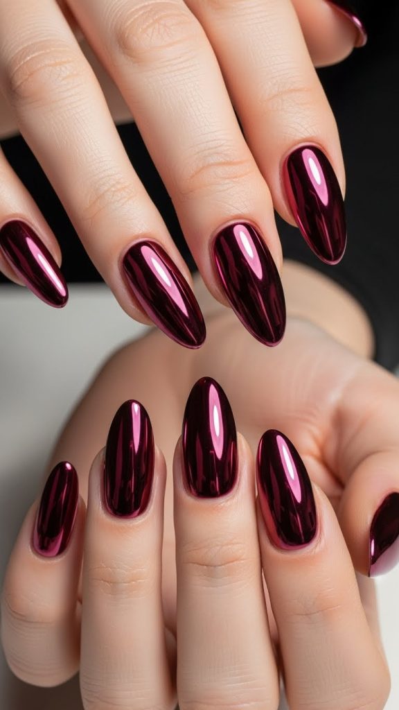 Burgundy chrome nails combine intensity and shine. Begin with thorough preparation and buff the nail plate slightly so the base adheres well. Use a black or dark burgundy gel polish as your base color. Apply one or two coats and cure each layer under a UV or LED lamp. Once fully cured, apply a no wipe top coat and cure it. Then gently rub burgundy chrome powder onto the surface using an eyeshadow applicator or silicone tool. Continue until the chrome effect becomes smooth and reflective. Dust off excess powder with a soft brush and apply another layer of top coat to seal the chrome. Cure again. This look requires gel products for the chrome process to work effectively. Burgundy chrome nails are eye catching and luxurious, ideal for special events or festive seasons. The reflective finish provides a unique twist on traditional dark shades while maintaining complete elegance.