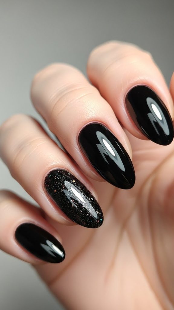 Black nails with dark glitter accents offer elegance with subtle sparkle. Begin with full nail preparation, focusing on smoothing the nail surface. Apply a base coat and two layers of black polish. Allow each coat to dry properly. Next, choose a dark glitter polish in shades like black, deep blue, charcoal, or dark purple. Apply it to one or two accent nails, or use it lightly on the tips for a gradient effect. If using loose glitter, dab clear polish onto the desired areas before sprinkling the glitter. Press gently to flatten the texture. Finish all nails with a top coat to seal the design and add durability. The glitter provides dimension without overwhelming the look, making it appropriate for celebrations, evening events, or as an everyday elegant statement. The combination of black and subtle shimmer creates a polished and balanced aesthetic.