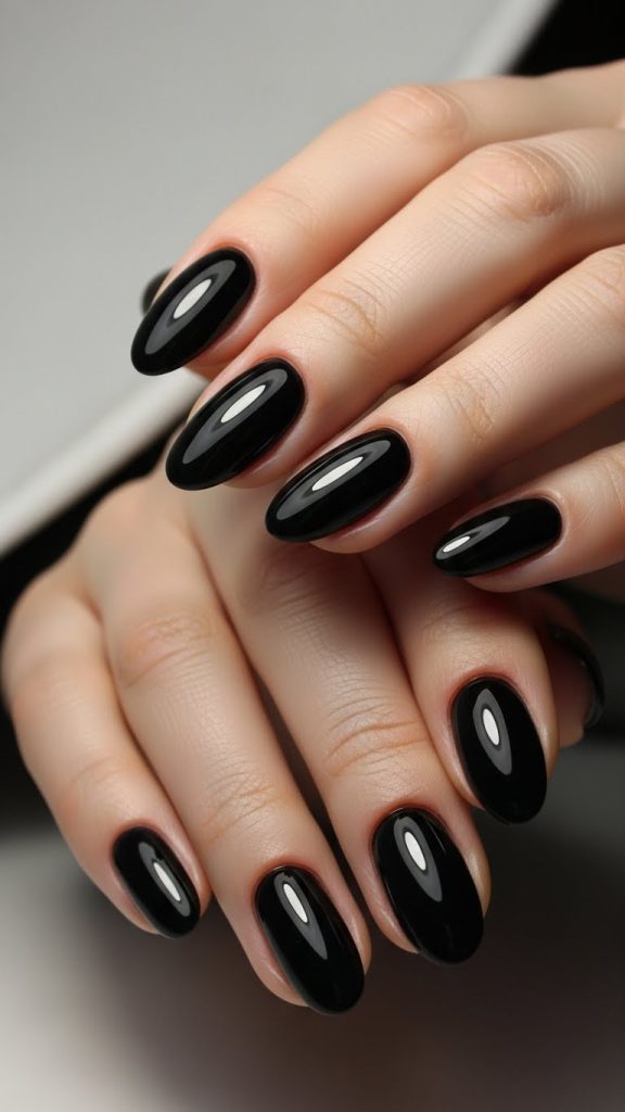 Glossy black nails are a universal symbol of sophistication. Before application, prepare your nails by shaping them with a fine grit file and removing surface oils with a nail cleanser or pure acetone. Push back the cuticles gently and buff lightly to ensure proper adhesion. For materials, you will need a high quality black nail polish, a smoothing base coat, and an ultra glossy top coat. Start by applying a thin layer of base coat to protect the nail and create an even foundation. Follow with two coats of black polish, making sure each coat dries fully before applying the next to prevent streak marks. Seal with a high shine top coat, applied generously to create a glass like reflective surface. Allow the nails to dry without disturbance. The final result is a refined and dramatic finish suitable for evening events, photoshoots, or everyday wear when you want to maintain a bold, polished style.