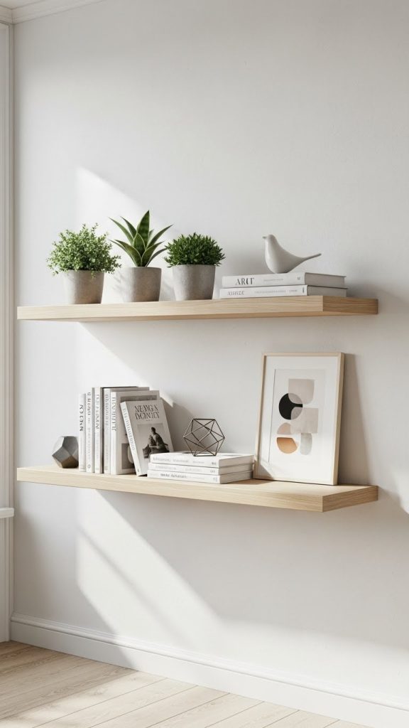Floating shelves are a practical and stylish addition to any home. Creating simple shelves for under twenty dollar is achievable with inexpensive wooden planks, brackets, and basic hardware. Start by taking measurements of the area where you want the shelves. This ensures proper fit and proportions. Light sanding may be required to smooth rough edges on the wooden boards. You may optionally stain or paint the wood for aesthetic enhancement using low cost sample paints. After preparing the wood, locate studs in the wall or use strong anchors if studs are not available. Install metal brackets which are usually very cheap at hardware stores. Attach the shelves firmly to the brackets using screws. Decorative floating shelves add vertical storage and provide space to display books, plants, or personal items. They also help reduce clutter by utilizing wall space instead of floor surfaces. These shelves bring structure and style to any room and are particularly useful in small spaces where organization is necessary. With careful measurements and simple installation steps, floating shelves create a visually appealing and functional upgrade at a very low cost.