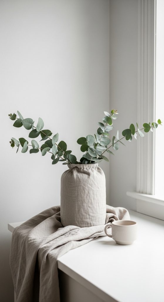 Cut the linen to fit the height and circumference of your vase, again leaving extra edges for folding. Apply a thin, even layer of craft glue and begin wrapping the vase slowly. Because linen is slightly stiffer than cotton, take your time to ensure it adheres smoothly without forming raised seams. Once the fabric is fully wrapped, fold the excess inside the top and bottom of the vase. You can add a decorative linen strip vertically for a clean lined finish. This minimalist linen vase pairs beautifully with dried pampas grass, white flowers, or eucalyptus stems. It becomes a timeless decor piece that suits living rooms, office desks, or bedroom nightstands without overwhelming the space.