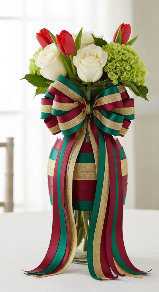 A ribbon wrapped vase uses strips of fabric ribbon instead of full fabric sheets, creating a decorative and layered effect. Choose ribbons of different widths, colors, or textures depending on your desired pattern. Satin, grosgrain, lace ribbon, and cotton ribbon all work well. You can wrap the ribbons vertically, horizontally, or diagonally across the vase.