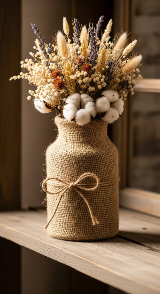 Place the vase on the fabric and measure the amount needed to wrap around fully. Apply strong craft glue and gently press the burlap onto the vase, smoothing it down but allowing some texture to remain visible, as that is part of burlaps charm. For the top and bottom edges, fold the burlap inward and glue it neatly inside the rim and base of the vase. If you want an added decorative touch, you can wrap a strip of jute twine around the upper portion or tie a bow near the center. This style works well for farmhouse themed spaces, outdoor patio decor, and warm toned interiors where natural materials stand out beautifully.