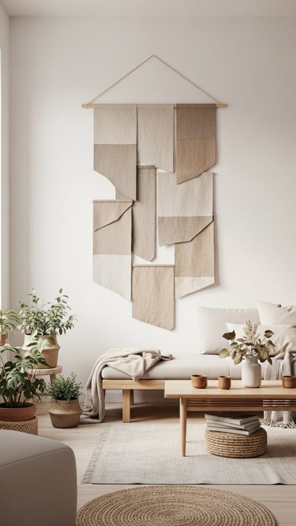 A neutral fabric wall hanging gently introduces texture into a minimal home without overwhelming the visual landscape. Minimalism benefits from natural fibers, soft colors, and organic movement, which is why linen and cotton fabrics are ideal for this project. The hanging creates depth on a blank wall without requiring complex artwork or bright tones. The beauty of this DIY project lies in its simplicity. You can design geometric layers, straight vertical strips, or asymmetrical shapes that align with your homeโs aesthetic. Because the colors remain subdued and consistent, the final result maintains a calm presence. This project also enables personalization since the length, width, and layering can be fully customized. Unlike traditional framed art, a fabric hanging softly moves with airflow, adding a subtle dynamic quality to the room. It introduces warmth while remaining true to the principles of minimalism. Since the materials are inexpensive and easy to assemble, it is an excellent option for renters who need lightweight and nonpermanent decor. Whether hung above a bed, sofa, or hallway console, a neutral wall hanging will elevate the room with clean and understated style.
