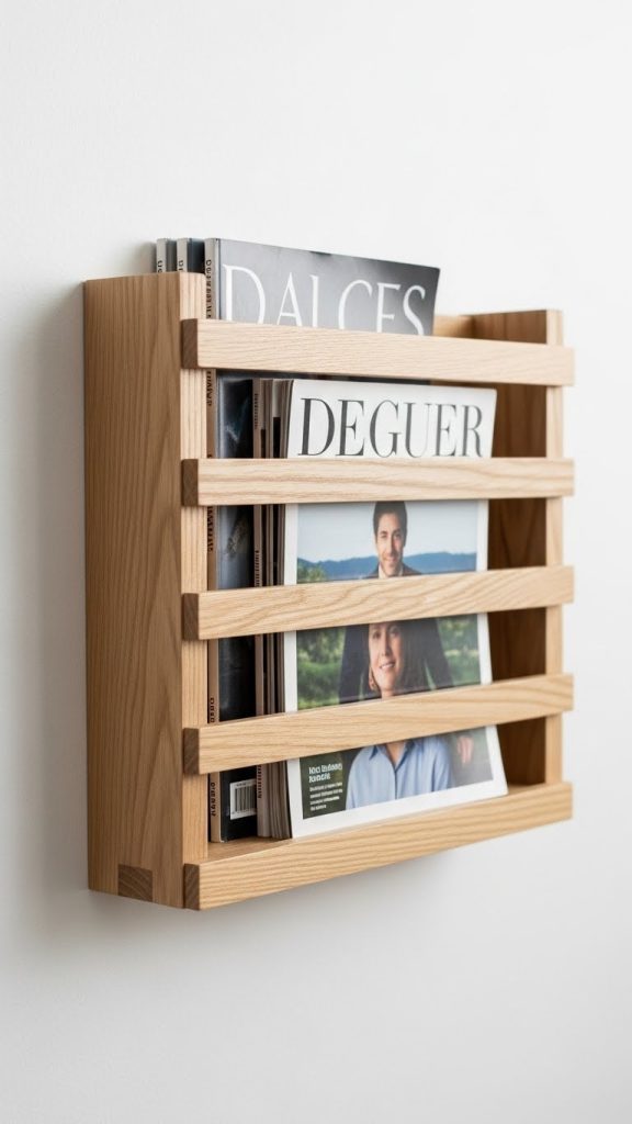A wall mounted magazine rack is ideal for maintaining order in a living room, office, or bedroom. It functions as both storage and decor, making it a valuable feature for minimal interiors. Cluttered stacks of books and magazines create visual distraction, but a slim rack organizes them neatly while contributing to the roomโs design. This DIY project involves creating a narrow open front shelf that holds reading materials upright. The rackโs thin profile allows it to fit in small spaces such as beside a sofa or beneath a window. When built from smooth wooden planks and sealed with a matte finish, the rack blends seamlessly into the surrounding decor. Its open design keeps the look airy and uncluttered. The goal is not to fill it with many items, but to select a few aesthetically pleasing publications or journals that complement the space. This project supports the minimal principle of reducing unnecessary objects while still offering functional storage. It is simple to construct and adds a touch of intentional design to your home.