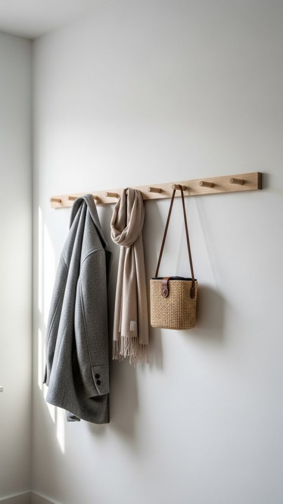 A wooden peg rail is one of the most functional and aesthetically pleasing additions to a minimal home. It blends storage and decor into one purposeful design element. Peg rails are suitable for entryways, kitchens, bedrooms, or bathrooms. They provide a designated spot for hanging coats, towels, baskets, or accessories, helping reduce clutter and visual noise. The project involves attaching evenly spaced pegs to a wooden board and mounting it securely on the wall. When finished with a matte seal, the natural wood grain remains visible, adding warmth and organic texture to the room. In minimal design, every item should have a clear function, and a peg rail exemplifies this principle. It organizes daily essentials while appearing clean and understated. The ability to hang decorative pieces such as small wreaths, canvas bags, or scarves allows you to change the look of the space without overwhelming it. A peg rail also encourages tidiness, making it ideal for households seeking a streamlined environment. Its simplicity, practicality, and natural appearance make it an essential DIY project for creating a spacious and intentional home.