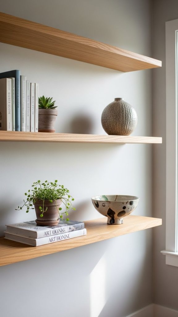 Minimal floating shelves are one of the most effective DIY additions for a clean and modern home. These shelves support the foundations of minimalism by eliminating bulky furniture and visually heavy storage. When installed correctly, the hardware remains hidden, making the shelves feel like they are seamlessly emerging from the wall. This effect helps create an airy and uncluttered look that works in living rooms, kitchens, bedrooms, and even entryways. The true beauty of minimal floating shelves lies in their versatility. You can display a small curated selection of books, a single plant, or neutral ceramic pieces. The goal is not to fill the shelf but to choose items that add purpose and balance. Their clean lines also help your walls look more spacious. This project is simple enough for beginners yet impactful enough to change an entire room. With careful measurement and attention to finishing details, floating shelves enhance the sense of order and intentionality that defines minimal decor. They provide storage without overwhelming the room and allow you to style your home with simplicity and elegance.