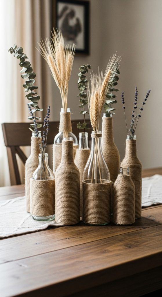 Twine wrapped bottles transform simple glass bottles into rustic decorative pieces perfect for tabletops. Begin by collecting empty glass bottles of various shapes, twine or jute rope, hot glue, and scissors. Clean and dry each bottle thoroughly. Apply a small amount of glue near the base and attach the end of your twine. Wrap the bottle tightly, adding small lines of glue as you proceed upward. Continue until you reach the top of the bottle, then secure the final end. These twine wrapped bottles can be displayed individually or grouped for a more dramatic effect. You can insert dried stems, add small charms, or leave them plain. Their natural texture makes them suitable for earthy or farmhouse themed decor. This project is inexpensive and accessible, using materials that are often already available at home. Twine wrapped bottles add height and visual interest to table arrangements without overwhelming the space.