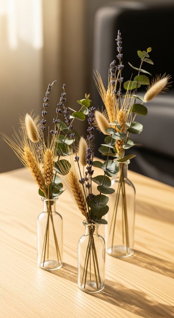 Dried flower arrangements are long lasting decor pieces that bring nature inspired charm to any tabletop. To create your own arrangement, gather dried flowers such as lavender, eucalyptus, wheat stems, gypsophila, or preserved leaves. You will also need small vases or jars, floral tape, scissors, and optional ribbon. Begin by selecting your vase and determining the arrangement size. Trim each stem according to the desired height. Group the flowers and foliage in your hand to form a balanced arrangement. Experiment with placements until you achieve harmony among colors and textures. Secure the base of the bouquet with floral tape to maintain its shape. Insert the bouquet into the vase and make final adjustments. Dried arrangements work well on dining tables, coffee tables, or workspace desks. They do not require water and maintain their beauty for months. Their soft colors and delicate textures create a calming visual presence. This DIY project allows you to explore natural materials without the maintenance required for fresh flowers. You can create seasonal variations by choosing stems in warm tones for autumn or pastel tones for spring. These arrangements elevate table decor effortlessly.