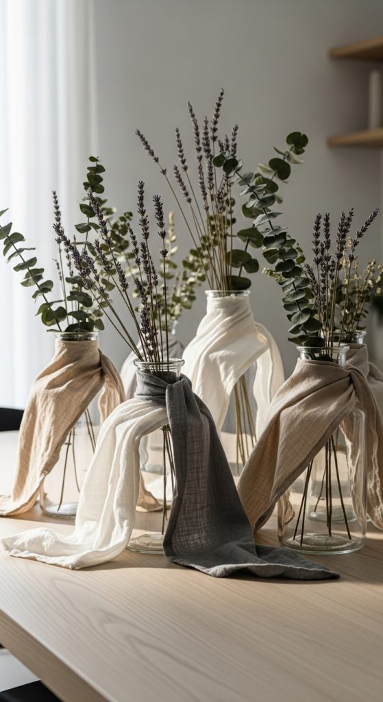 Fabric wrapped vases offer a creative way to transform simple glass jars or old vases into elegant decor accents. Start by selecting fabric that suits your color palette or table theme, such as linen, cotton, or canvas. Gather scissors, fabric glue, measuring tape, and the vase you want to wrap. Prepare the vase by cleaning its surface to help the fabric adhere smoothly. Measure the height and circumference of the vase to determine the fabric size. Cut the fabric with a small allowance for overlapping edges. Apply glue evenly to the vase surface and slowly wrap the fabric around it, smoothing out air bubbles or creases as you work. Fold the fabric neatly at the top and bottom for a clean look. You may add decorative ribbons or twine for added texture. These vases can hold dried flowers, artificial stems, or simply be displayed as standalone objects. They work particularly well as table centerpieces due to their softness and handcrafted charm. Fabric wrapped vases also give you the freedom to match seasonal themes by choosing appropriate colors and prints. This project allows for creative experimentation and can be completed within a short time frame.