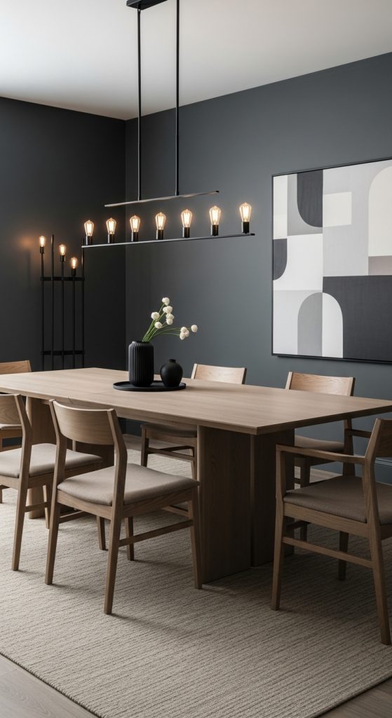 Charcoal gray walls combined with light wood furniture create a modern yet elegant aesthetic. The dark walls provide sophistication and intimacy, while light wood elements prevent the space from feeling heavy.