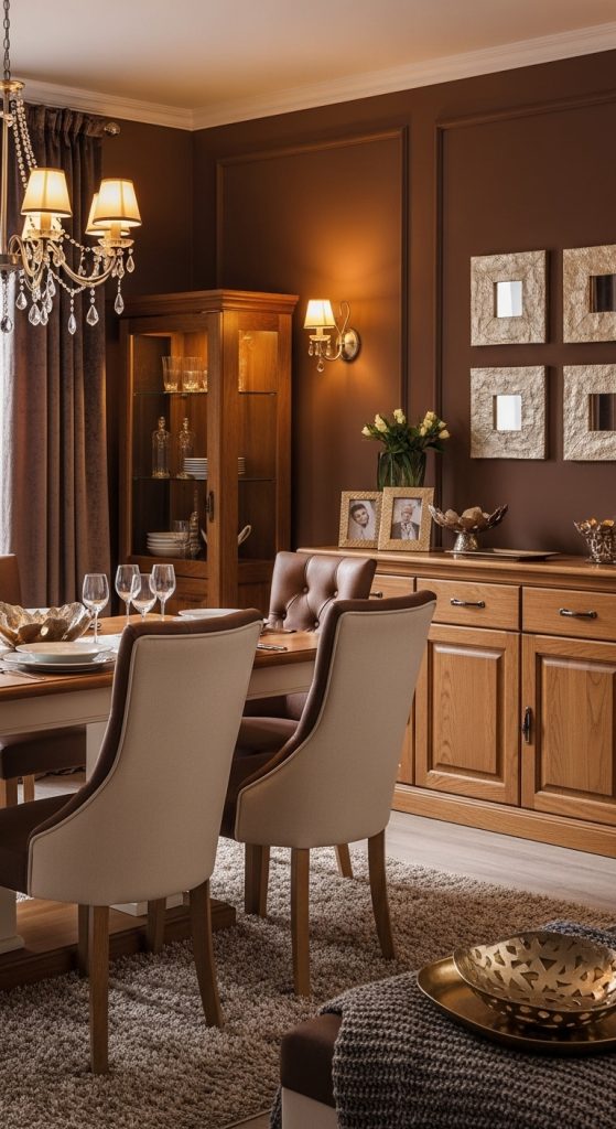 Add wooden or leather furniture, textured rugs, and soft fabrics to enhance tactile warmth. Preparation includes testing brown shades under different lighting to ensure richness without darkness. Incorporate metallic accents like gold or bronze in fixtures or décor to elevate the elegance. This palette exudes intimacy, sophistication, and comfort, perfect for creating an inviting dining space that is both elegant and welcoming.