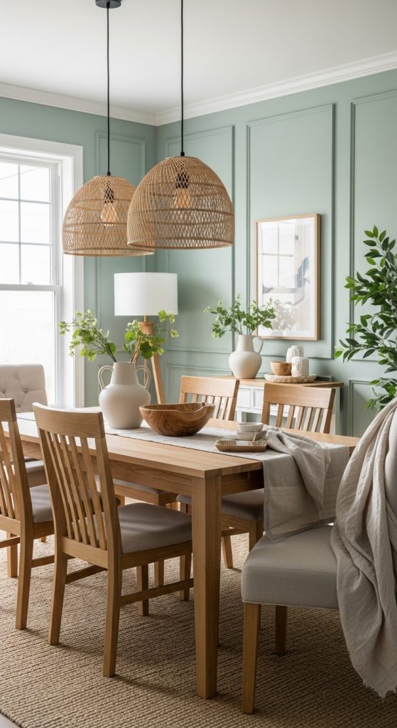 Add natural wood or rattan furniture and soft textiles to introduce warmth and texture. Preparation involves selecting a muted sage tone that complements lighting and balancing it with white elements to prevent the room from appearing cold. Layered lighting with pendant fixtures and table lamps enhances ambiance. This palette creates an airy and refined dining environment, perfect for casual gatherings and sophisticated entertaining alike.