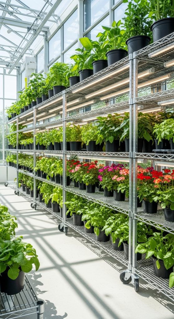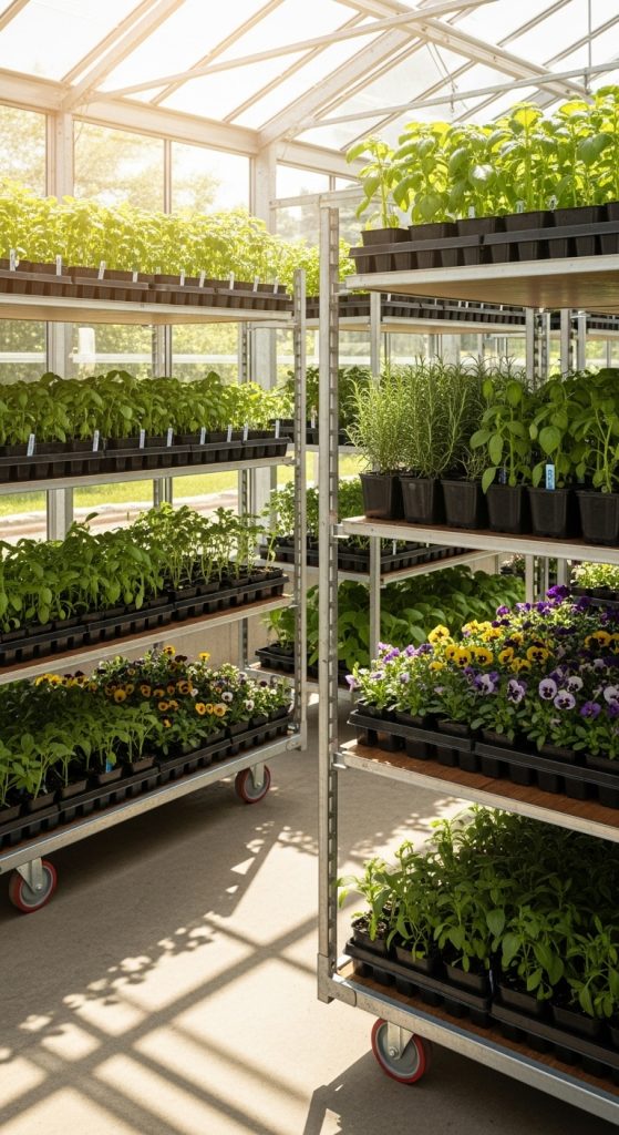 Rolling cart shelves provide mobility and flexibility, allowing you to move plants according to light needs or seasonal changes. These shelves typically feature multiple tiers and locking wheels for stability. Preparation involves choosing carts made of rust-resistant materials such as aluminum or coated steel. Each tier can be customized with wire or mesh inserts to improve drainage. Rolling carts are ideal for greenhouses that double as workspaces, as they can transport seedlings, soil, or tools easily. When not in use, they can be stored in corners or used as temporary display units. Maintenance is minimal, requiring only wheel lubrication and regular cleaning. They come in various heights and widths to suit different needs. Rolling cart shelves are excellent for dynamic greenhouse setups, giving plant lovers the convenience of movement and efficient organization.