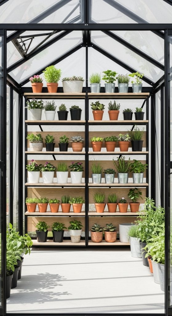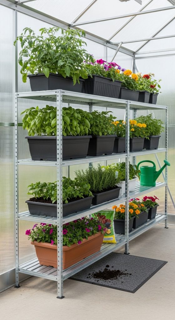 Aluminum shelving combines lightweight design with impressive strength, making it perfect for both hobby and professional greenhouses. Aluminum resists rust and corrosion, even in humid conditions. Preparation involves measuring your wall space and ensuring the shelves can be secured firmly. Many adjustable systems feature modular brackets that can be repositioned to accommodate various plant sizes. The sleek, metallic look also complements modern greenhouse designs. These shelves are easy to clean and maintain, requiring only periodic wiping to remove dirt. Aluminum shelving can be paired with wire or slatted inserts to improve air circulation. Because of its strength-to-weight ratio, it is ideal for supporting multiple heavy pots without bending. The materialโs durability ensures it lasts for years without deterioration. Adjustable aluminum shelving is the go-to option for serious plant enthusiasts who want flexibility, efficiency, and modern appeal.