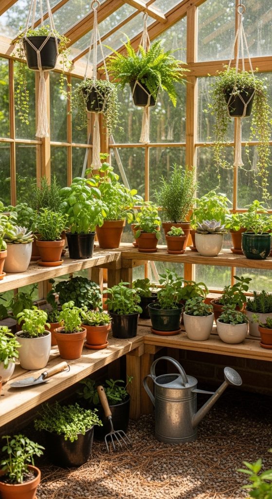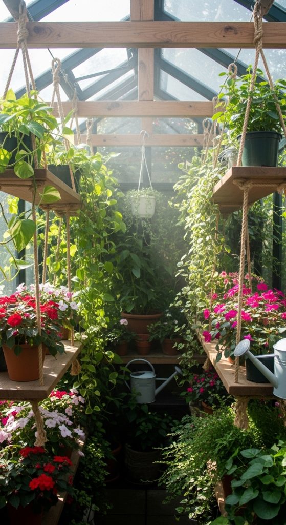 Hanging shelves make excellent use of vertical space in smaller greenhouses. They allow plants to receive equal light exposure and free up floor area for larger pots or walking space. Preparation involves checking the greenhouse ceiling or frame for structural strength before installation. Use durable chains, hooks, or metal cables to hang the shelves securely. Materials such as wire mesh, lightweight wood, or plastic trays work well for hanging racks. Tiered hanging designs are ideal for herbs, succulents, and seedlings. They promote air circulation and can even double as decorative displays. It is essential to ensure weight distribution is balanced to avoid strain on greenhouse supports. Hanging shelves add visual depth and functionality, making the space feel organized and airy. They are perfect for plant lovers seeking a creative and space-efficient solution that emphasizes accessibility and style.