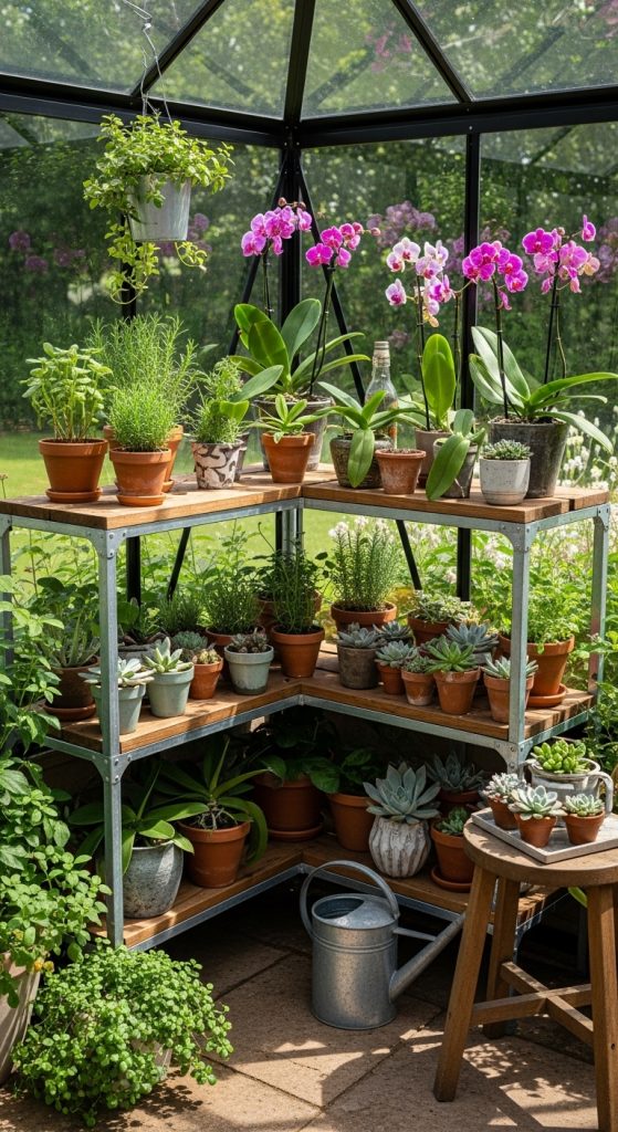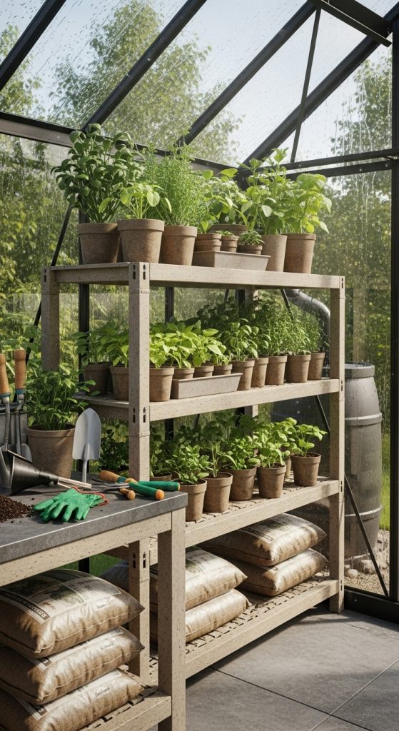 Corner shelving systems maximize every inch of greenhouse space, turning unused corners into productive areas. These shelves can be custom-built or modular, depending on your greenhouse layout. Preparation begins with measuring the corner dimensions to ensure proper fit. Materials like powder-coated metal, aluminum, or waterproof wood work well in humid environments. Corner shelves are ideal for smaller plants, seedlings, or gardening accessories. You can design them in triangular or curved shapes to suit the space. Their compact structure ensures no corner is wasted while maintaining open pathways for easy movement. These shelves also improve light distribution by positioning plants at various heights. Maintenance involves occasional cleaning and ensuring stability. Corner shelving systems provide both practicality and design balance, perfect for plant enthusiasts who value efficiency and organization in their greenhouse setup.