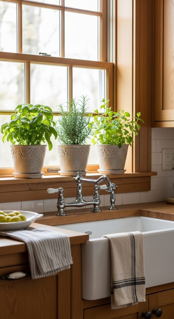 Style a few potted herbs (basil, mint, rosemary) in matching planters near a sunny window or corner. This adds life and functionality to your counter.