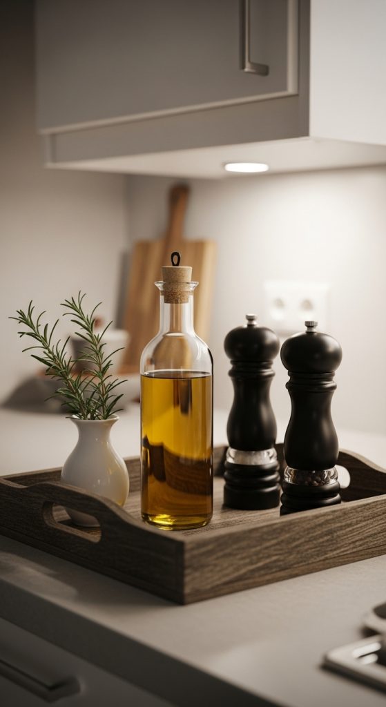 Use a tray to group daily-use items like olive oil, salt, pepper grinders, and herbs. It instantly makes clutter look curated.