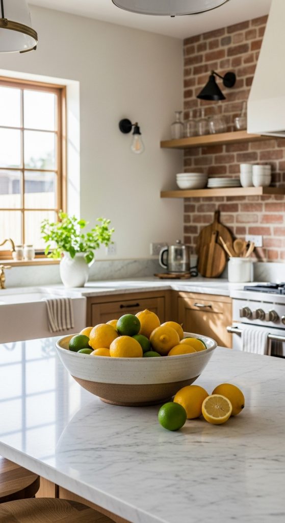 Use a chic fruit bowl, wire basket, or pedestal stand to display fresh lemons, apples, or avocados. Colorful produce adds life and organic beauty to the kitchen.