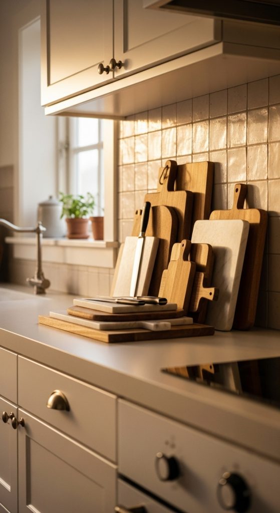Prop wooden or marble cutting boards vertically against the backsplash. Layer different sizes and finishes for a warm, rustic backdrop that adds texture and charm.