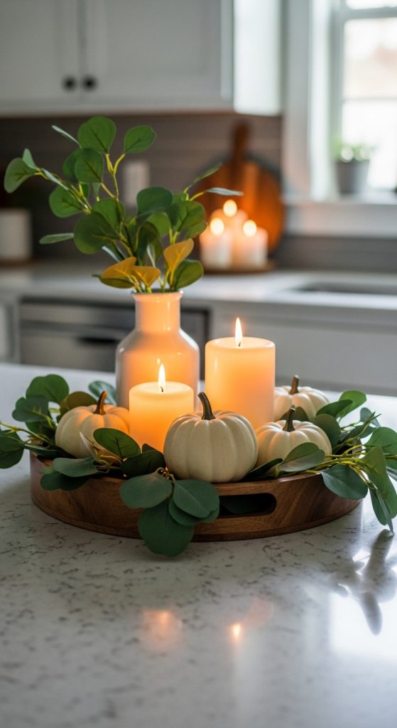 Rotate small seasonal decor like pumpkins in fall, eucalyptus in winter, or citrus in summer. Stay subtle for a fresh, styled look without clutter.