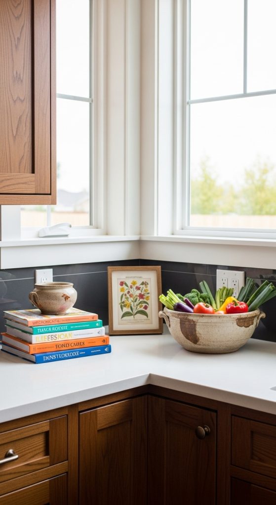 Stack a couple of cookbooks and lean a small framed art piece or quote behind them. This adds height, personality, and softness to the hard surfaces.
