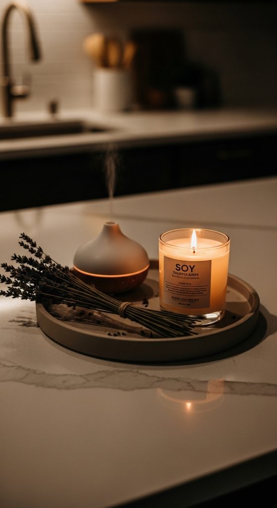 Create a calming moment with a styled candle tray—add a soy candle, a tiny essential oil diffuser, and a small dried floral bunch.