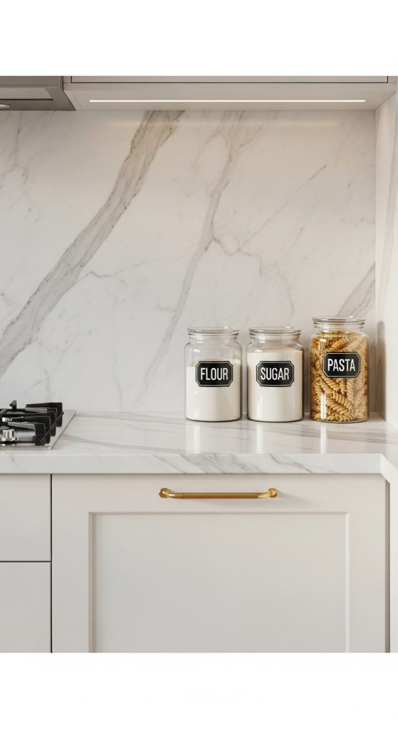 Display beautiful glass or ceramic canisters with essentials like flour, sugar, pasta, or snacks. Use matching labels or handwritten tags for a clean, organized look.