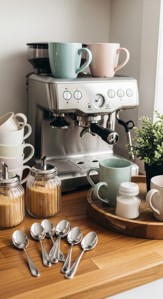 Create a cozy mini café right on your counter! Style a tray with a coffee machine, cute mugs, spoons, sugar jars, and a small plant.