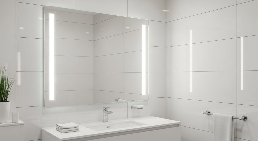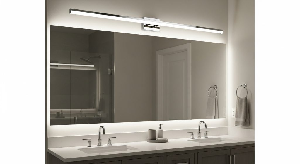 Vertical light bars installed on either side of a bathroom mirror create balanced, professional-grade illumination. This style is often used in makeup studios and hotel bathrooms because it provides even lighting across the entire face. Vertical fixtures are especially beneficial in bathrooms with large mirrors or limited ceiling height.