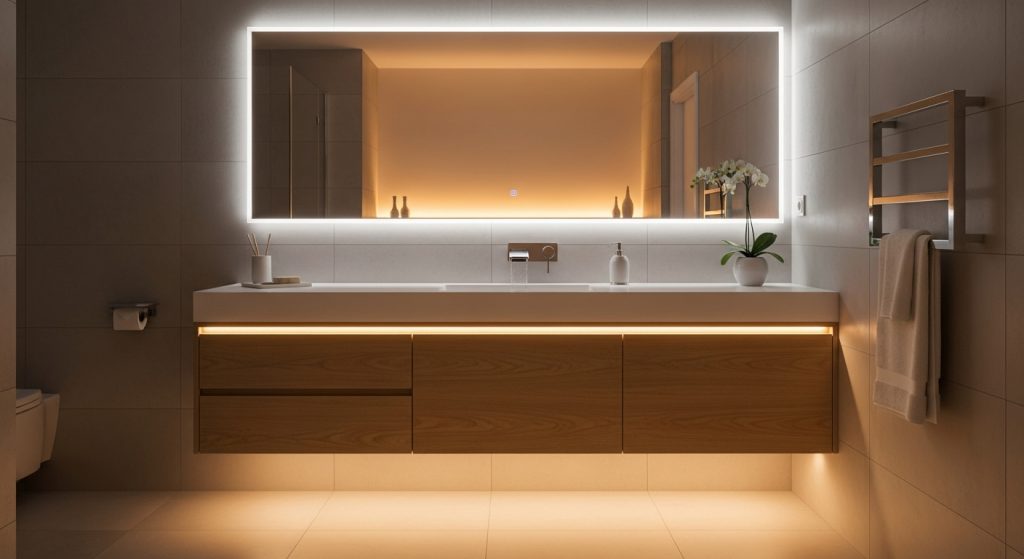 Under-cabinet or under-mirror lighting adds a subtle glow that enhances ambiance and improves visibility. This technique works well when you have a mirror mounted above a floating vanity or with built-in cabinetry. The light reflects upward, reducing shadows and adding depth to the space.