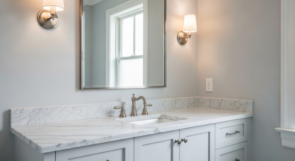 For preparation, choose fixtures with frosted or white glass shades to diffuse light softly. LED or halogen bulbs with a color temperature around 2700K to 3000K produce warm, flattering tones. When selecting sconces, coordinate the finish with your faucet or hardware to maintain design harmony. Brushed nickel, chrome, or matte black finishes complement most modern and transitional styles. Make sure the electrical wiring is placed symmetrically to ensure visual balance. Classic wall sconces can instantly add sophistication while improving daily functionality.