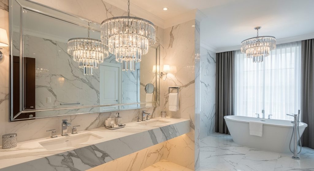 Adding a chandelier to your bathroom can bring elegance and drama, especially in larger spaces. While traditionally associated with living rooms or dining areas, chandeliers are increasingly popular in bathrooms for their luxurious impact. Positioned strategically near or above the mirror, they provide both task and ambient lighting.