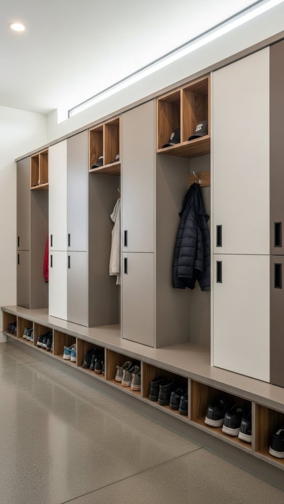 Ventilation is essential for damp items, so consider leaving a small gap or using slatted doors. Soft neutral colors help create a calming and uniform appearance. For families with children, label plates can be added above each locker to support organization without compromising aesthetics. Lockers create a streamlined and structured environment, helping families maintain an orderly home while enhancing the mudrooms modern design.