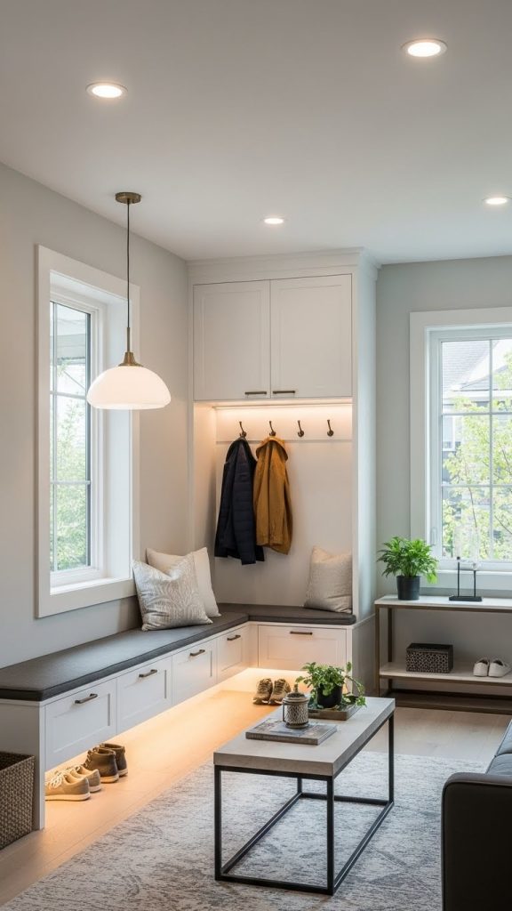Natural light also plays an important role. If your mudroom has windows, avoid heavy curtains and opt for simple blinds or frosted glass. Light colors on the walls help reflect brightness. Good lighting makes the mudroom safer, more inviting, and visually harmonious with modern home design.