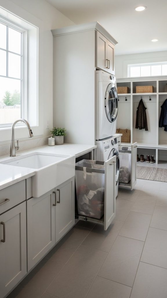 Choose cabinetry that hides laundry supplies and detergents. Flat panel doors and neutral finishes help maintain a sleek appearance. Built in hampers, pullout laundry baskets, and open shelves for linens create efficient storage zones. A deep utility sink is useful for rinsing muddy shoes, hand washing clothing, or cleaning sports gear.