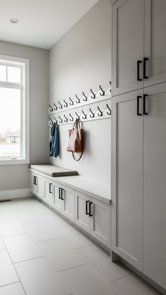 Install sturdy wall mounted hooks for coats, hats, and bags. Hooks made from metal with straight or slightly curved forms maintain a minimalist appearance. Avoid ornate or highly decorative styles. For families, consider installing double hooks at different heights to accommodate both adults and children.