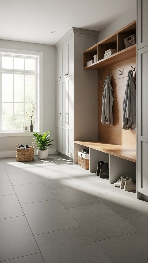 Flooring is one of the most important elements in a mudroom because this area experiences heavy foot traffic, moisture, and dirt brought from outside. Modern mudroom flooring should be durable, easy to clean, and visually appealing. When preparing for this design upgrade, evaluate materials such as porcelain tile, luxury vinyl plank, natural stone, and sealed concrete. These materials withstand moisture and resist wear over time.