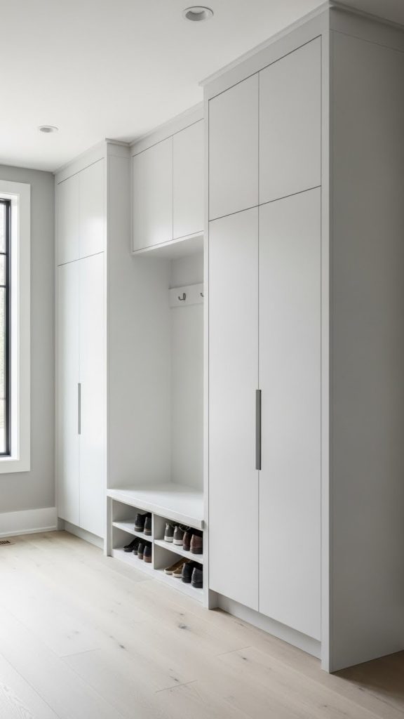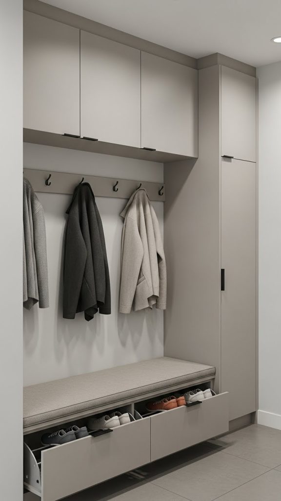 Hidden shoe drawers can be built into the lower part of a bench. These drawers keep piles of footwear out of sight and preserve the rooms clean lines. Upper cabinets with push to open mechanisms maintain a minimalist look without visible hardware. Wall mounted cabinets that extend to the ceiling maximize vertical space while hiding seasonal gear, cleaning supplies, or pet accessories.