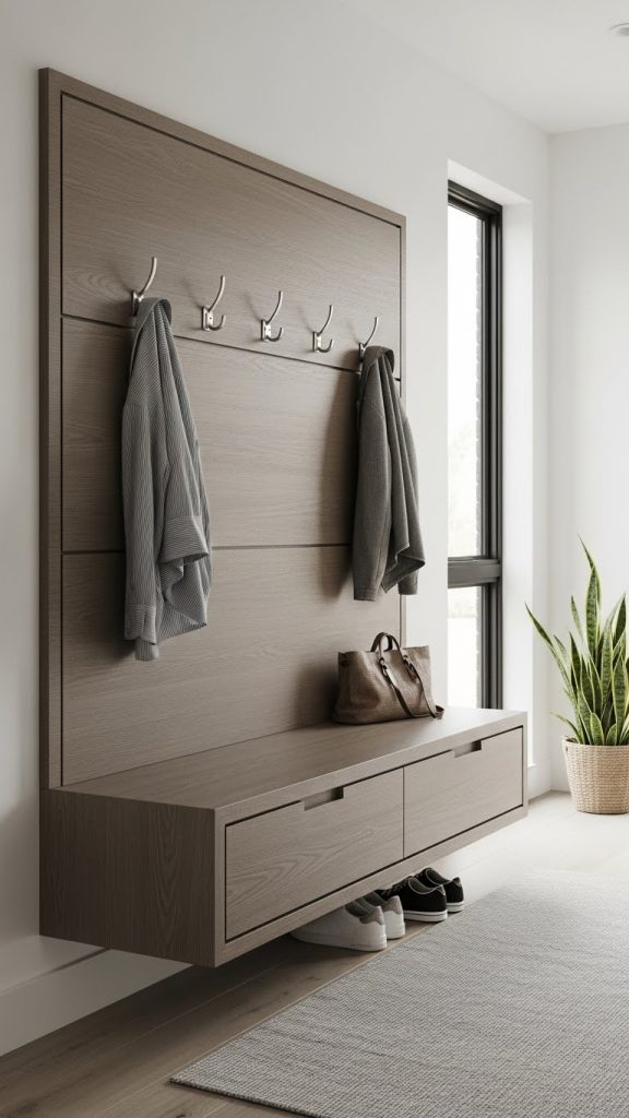 A common modern approach is a floating bench that appears to be suspended from the wall. This design creates visual openness and makes sweeping or mopping the floor easier. Another option is a built in cubby bench that includes storage compartments underneath. These compartments can hold baskets, boots, or sports gear. For the bench surface, aim for a neutral palette with smooth finishes. Natural oak, ash, and walnut tones blend well with modern interiors while providing durability and warmth.