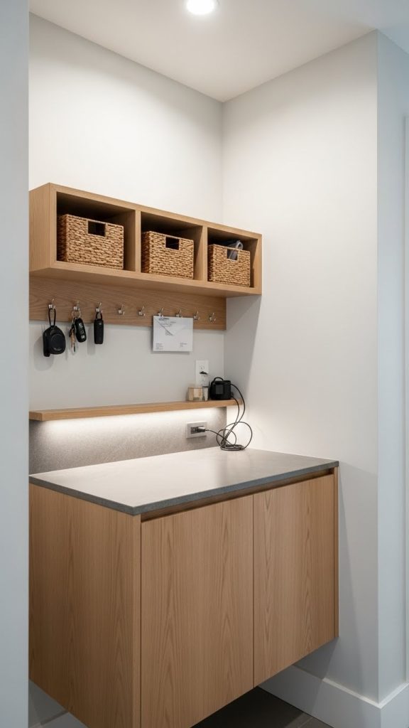 Incorporate small baskets or trays for keys, mail, and sunglasses. These containers help maintain order while keeping surfaces tidy. Wall mounted organizers, such as slim shelves or peg rails, can also support small items without taking up floor space. Choose minimalist designs that blend well with the rest of the mudroom.