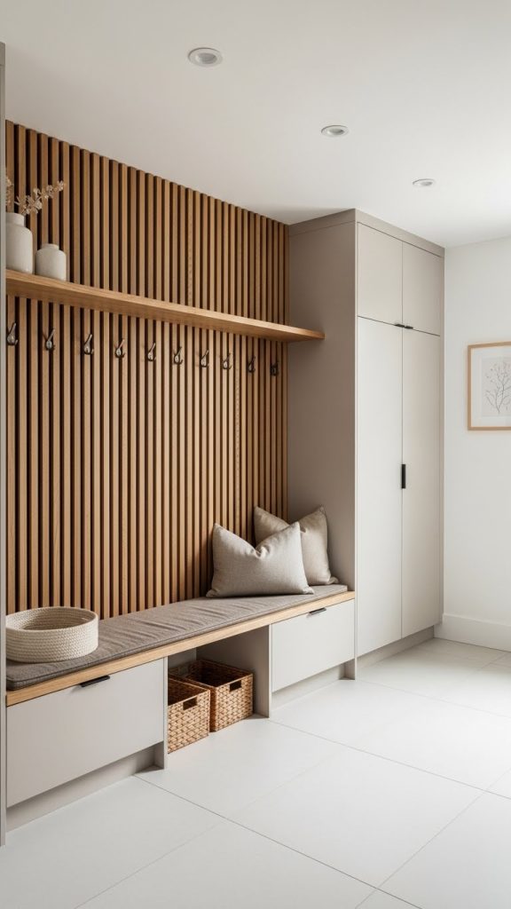 A wood slat accent wall behind the bench or storage area creates an architectural focal point. Choose narrow slats with even spacing to maintain symmetry. Medium to dark stains produce a rich and contemporary effect. MDF panels painted in matte finishes can provide a smooth and seamless surface.