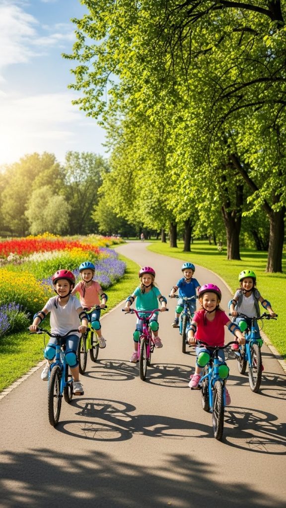 Tips: Start with short distances and gradually increase the duration as skills improve. Introduce games like “follow the leader” or timed races to make cycling more engaging. Encourage group cycling to foster social interaction. Cycling also helps children develop spatial awareness and endurance while providing a fun and eco-friendly outdoor activity.