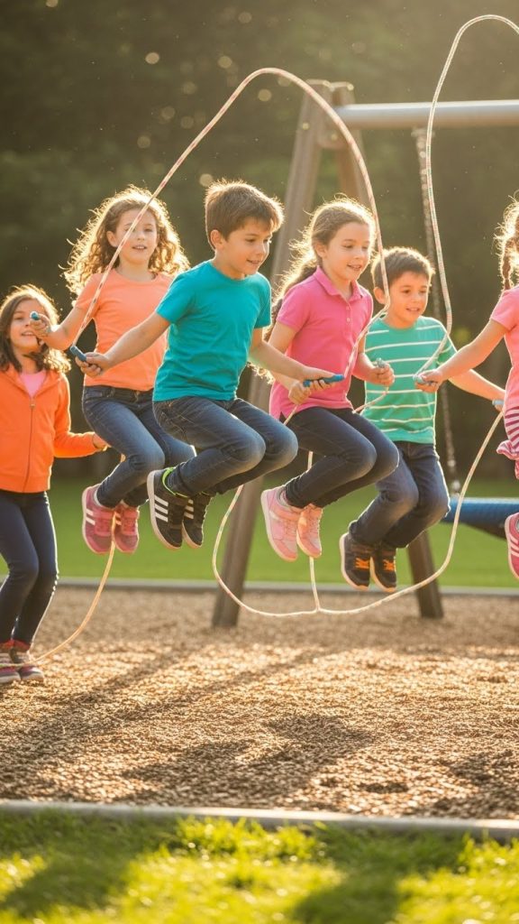 Tips: Introduce short sessions initially, gradually increasing duration and complexity. Incorporating counting or rhythmic music can make jumping rope more enjoyable. Encourage creative games such as “longest jump streak” or “team jumping” to maintain motivation. Jump rope is also portable, making it an ideal physical activity for both indoor and outdoor settings, and it promotes social interaction when children take turns or compete in friendly challenges.