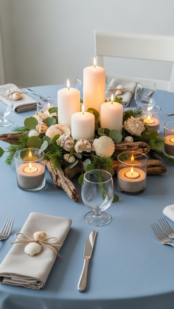 A coastal-inspired Christmas theme merges holiday warmth with seaside charm. Use light-colored tablecloths in beige, sand, or soft blue. Centerpieces can feature driftwood, seashells, white candles, and hints of greenery. Small glass vases with sand and candles add layered texture.