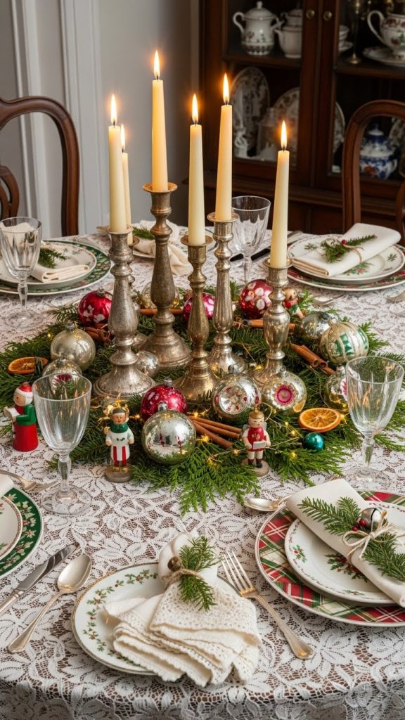 Vintage Christmas dรฉcor brings nostalgic charm with classic ornaments and antique-inspired accents. Start with a lace or embroidered tablecloth. Use vintage candle holders, old-fashioned ornaments, and small wooden figurines for the centerpiece.